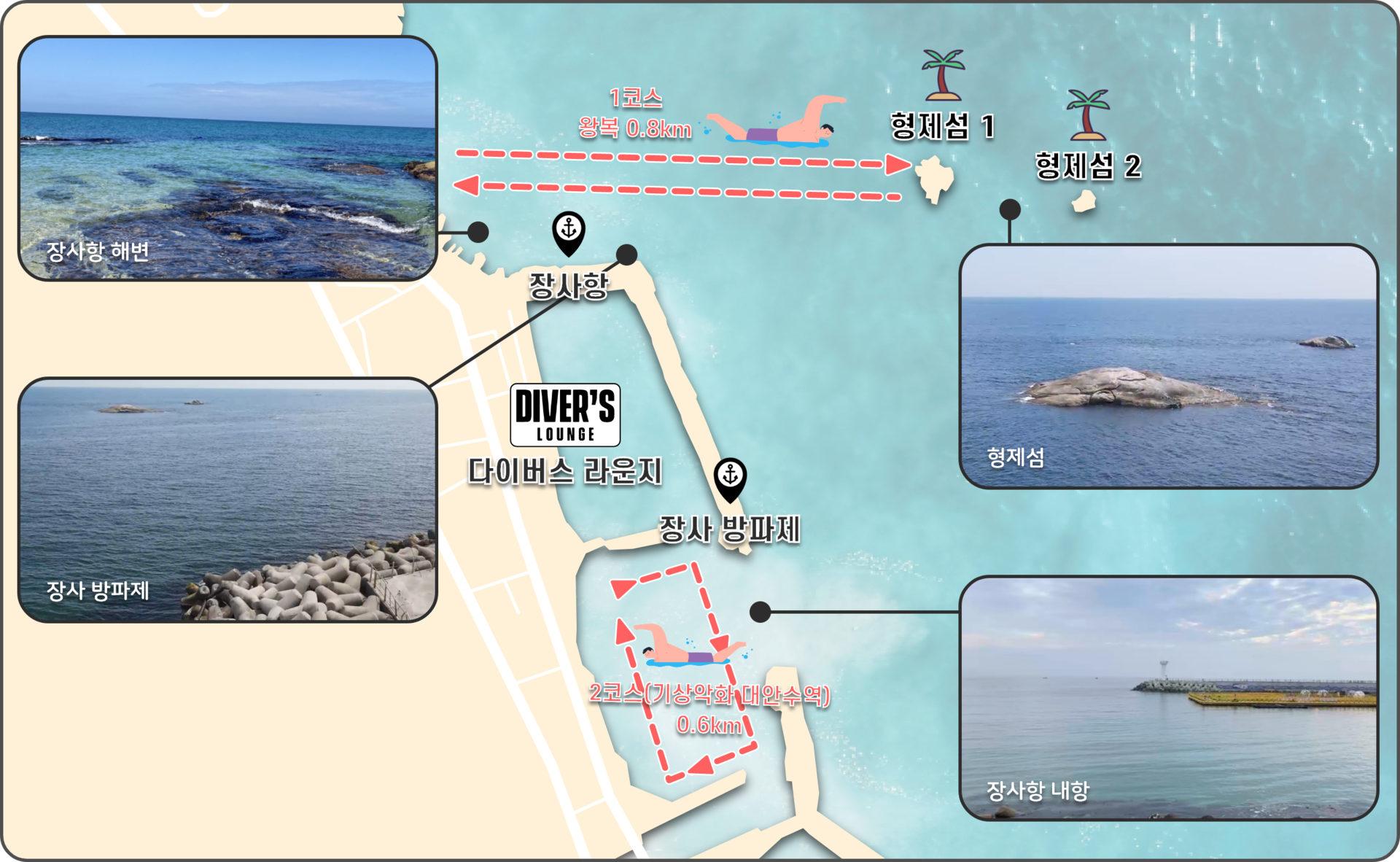 1코스: 장사항 해변 → 형제섬 왕복 (약 0.8km)